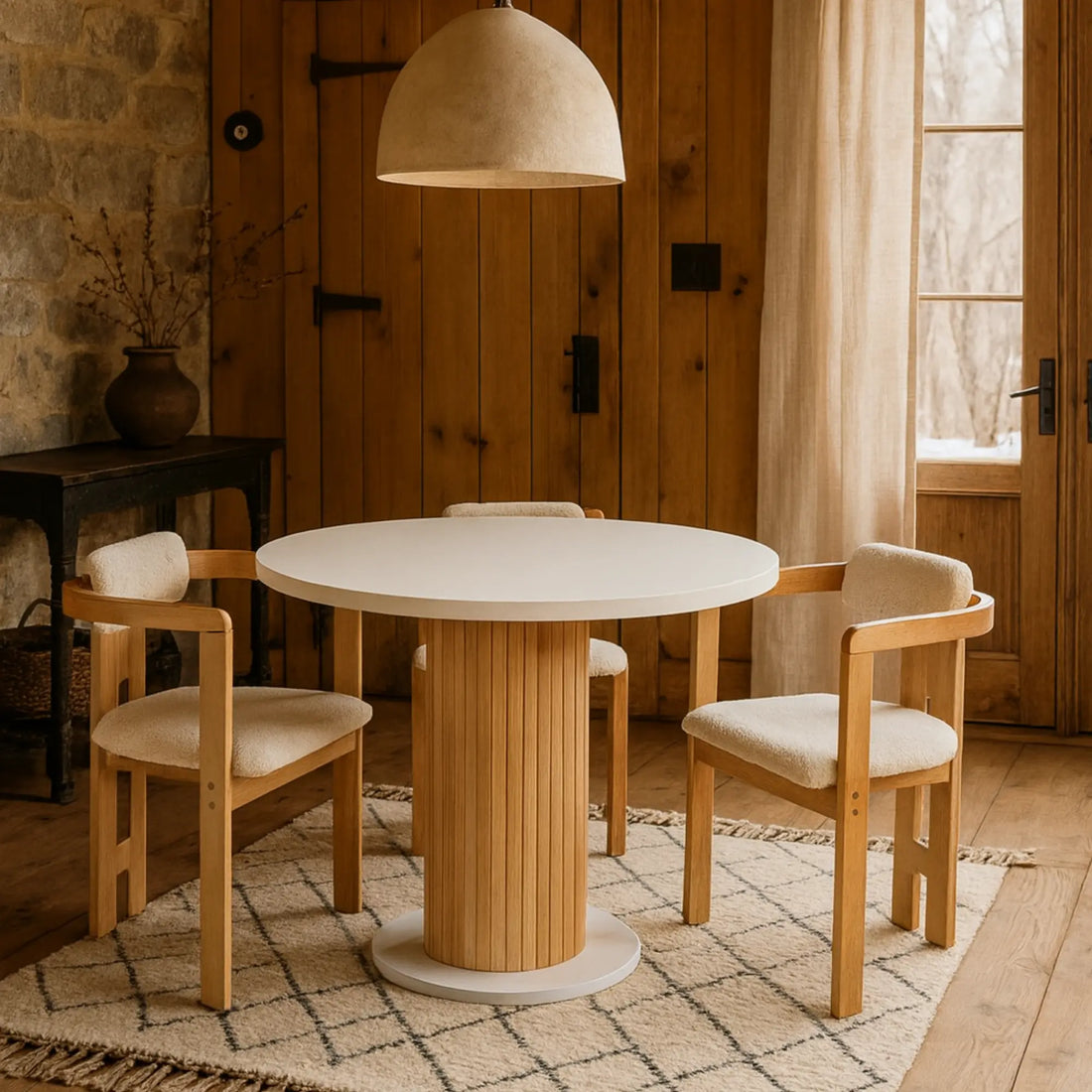 Doğal detaylarla zenginleştirilmiş bu 4 kişilik yuvarlak masa, modern bohem yaşam alanlarına sıcaklık ve zarafet...