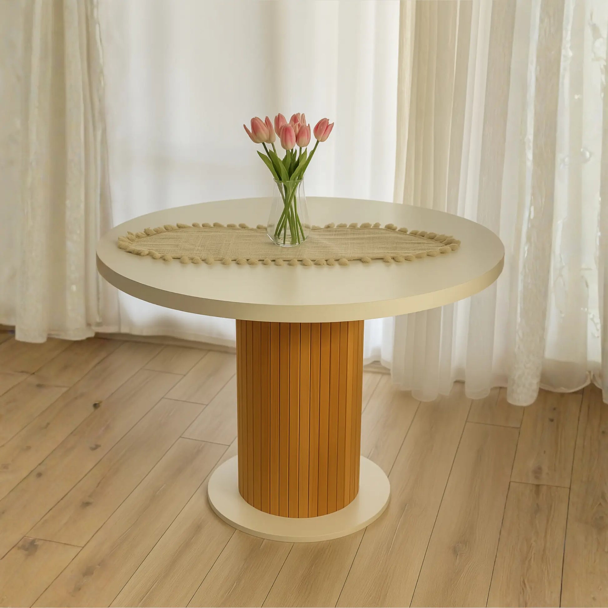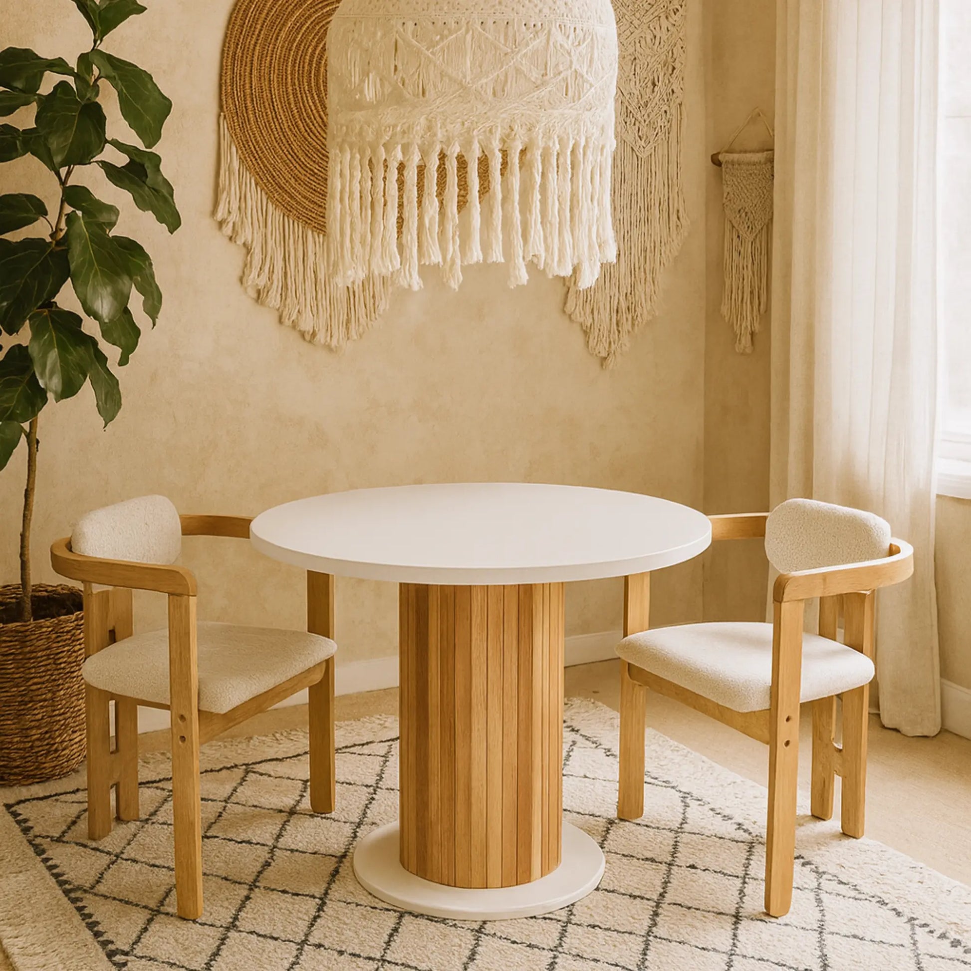 Doğal detaylarla zenginleştirilmiş bu 4 kişilik yuvarlak masa, modern bohem yaşam alanlarına sıcaklık ve zarafet katıyor. 36 mm kalınlığında çift katman MDF tabla, dayanıklılığıyla uzun ömürlü kullanım sunarken; doğal ahşap görünümlü silindirik orta ayak yapısı sayesinde alana estetik bir dokunuş kazandırıyor.