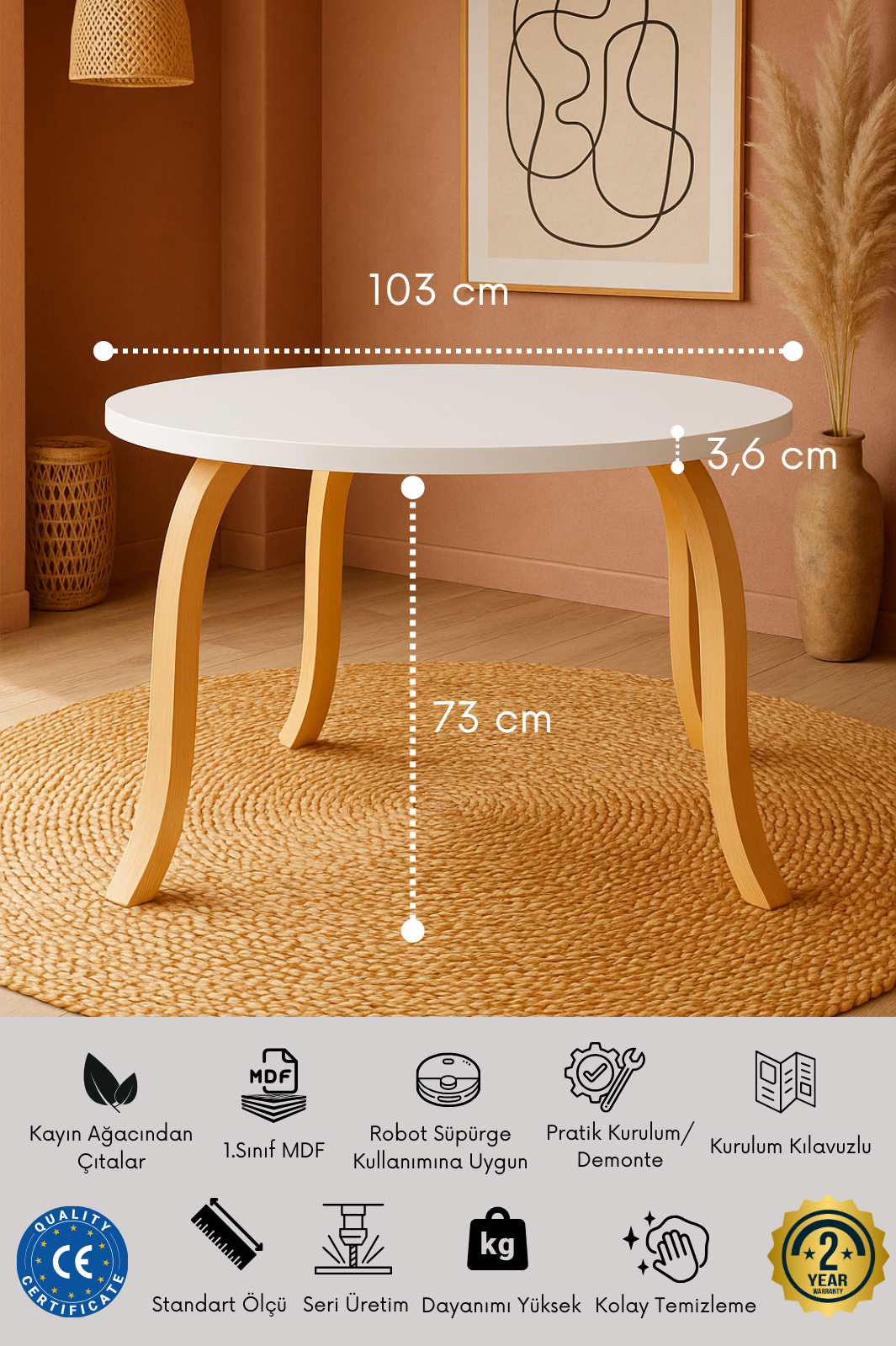 • 103 cm çapında geniş yuvarlak tabla sayesinde 4 kişilik rahat kullanım alanı sunar.