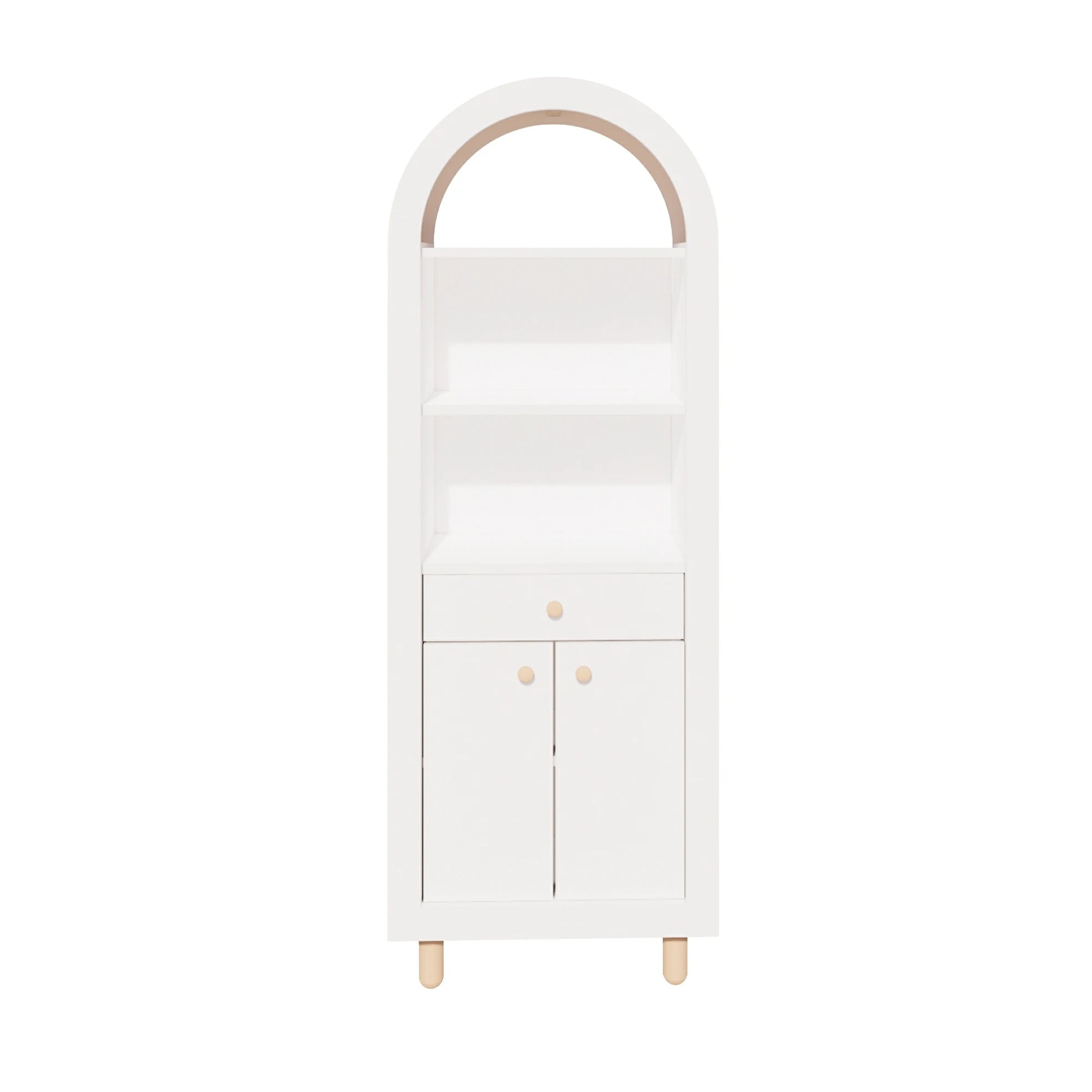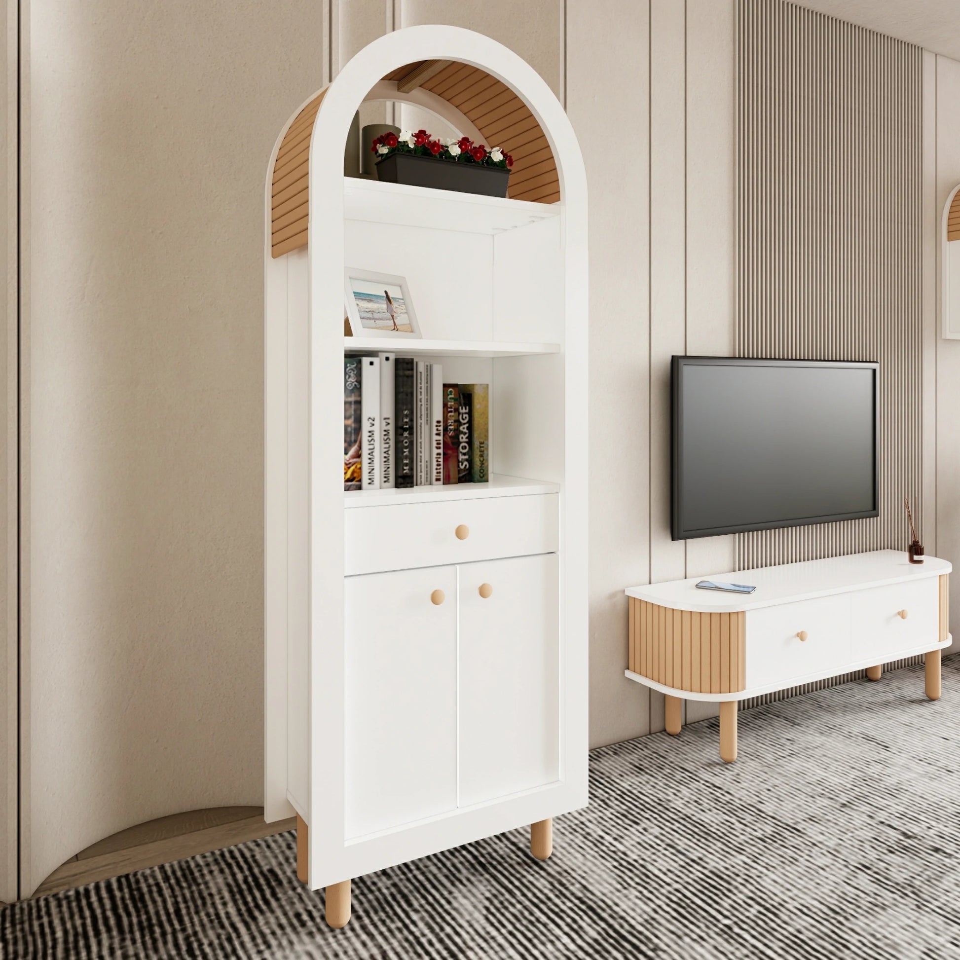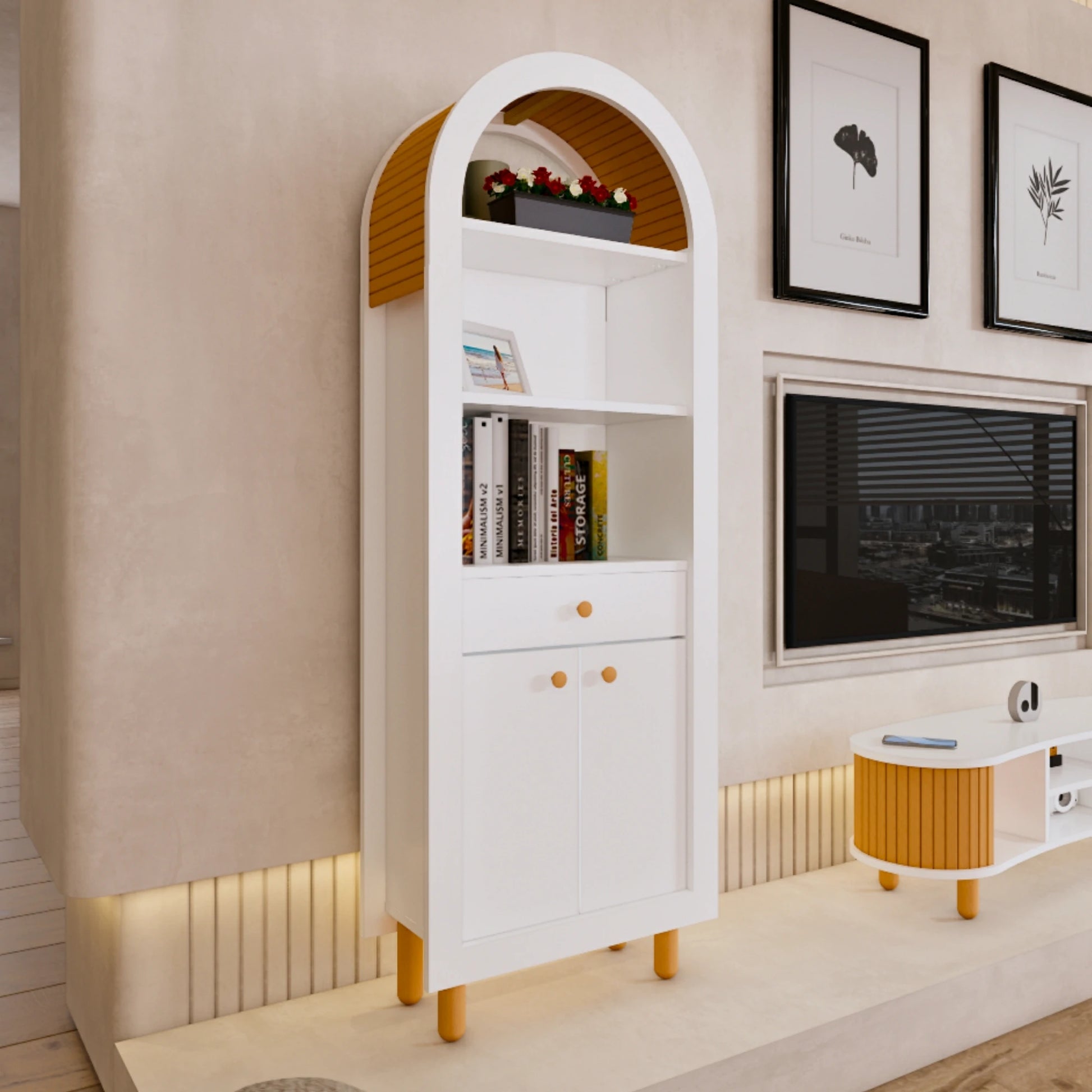 Bu modern beyaz ahşap kitaplık, hem estetik görünümü hem de fonksiyonel yapısıyla yaşam alanlarınıza şıklık katmak için tasarlanmıştır. Kavisli üst kısmı ile dikkat çeken tasarım, üst raflarda dekoratif objeler ve kitaplar için geniş alan sunarken, alt bölümdeki kapaklı dolap ise düzenli bir depolama imkanı sağlar. Minimalist çizgileri ve sıcak tonlardaki detaylarıyla her türlü iç mekana uyum sağlar.