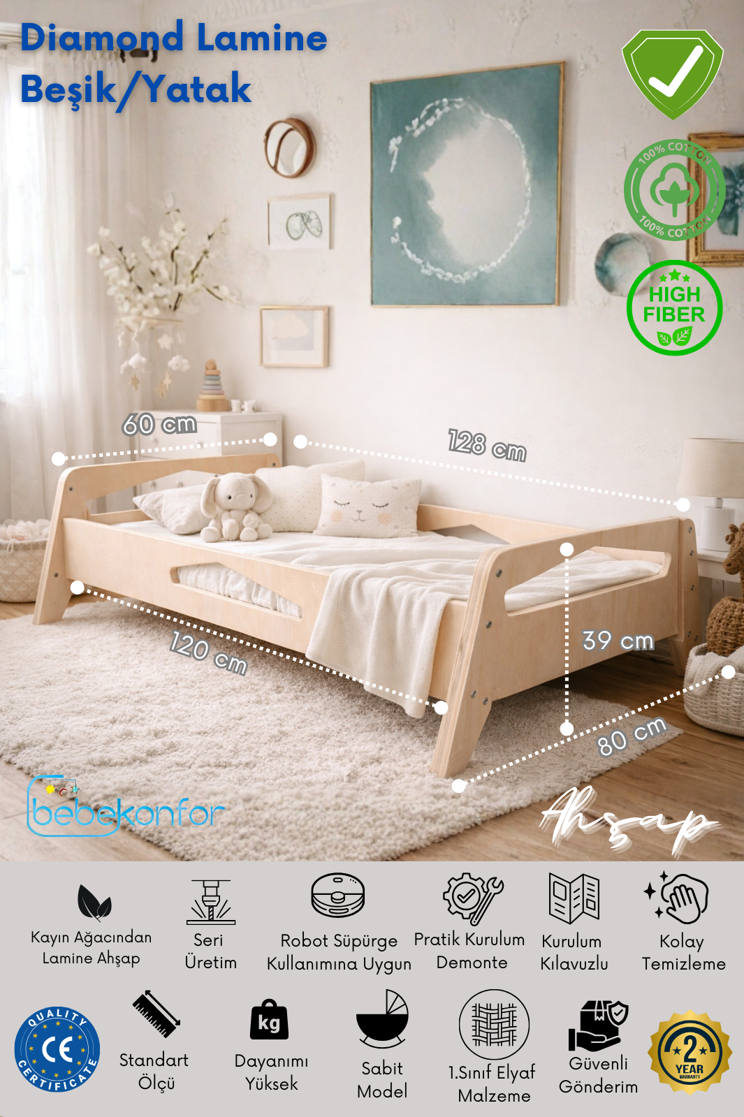 Diamond Lamine Beşik / Yatak | Yatak Hediyeli | Doğal Kayın Ahşap | 60x120 cm