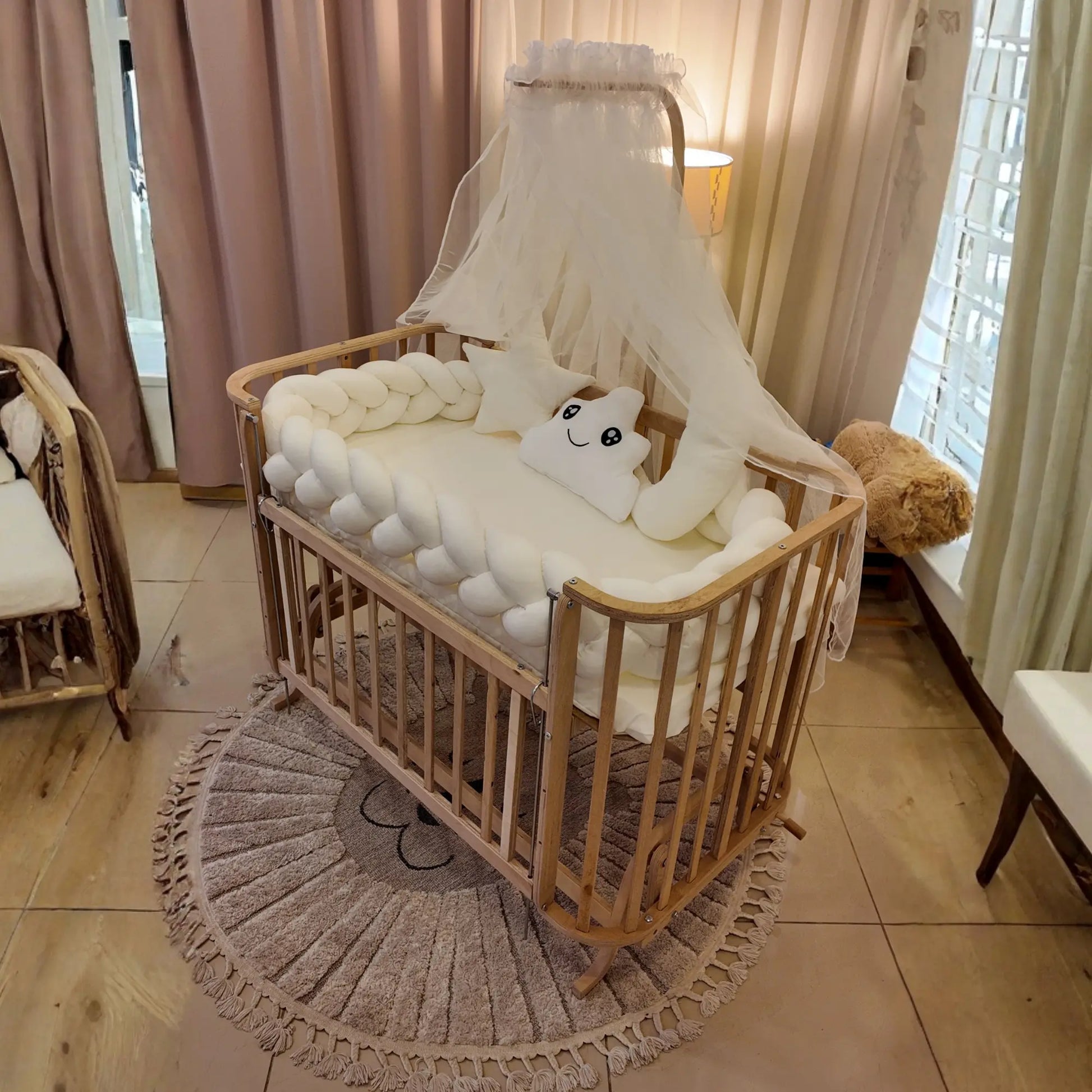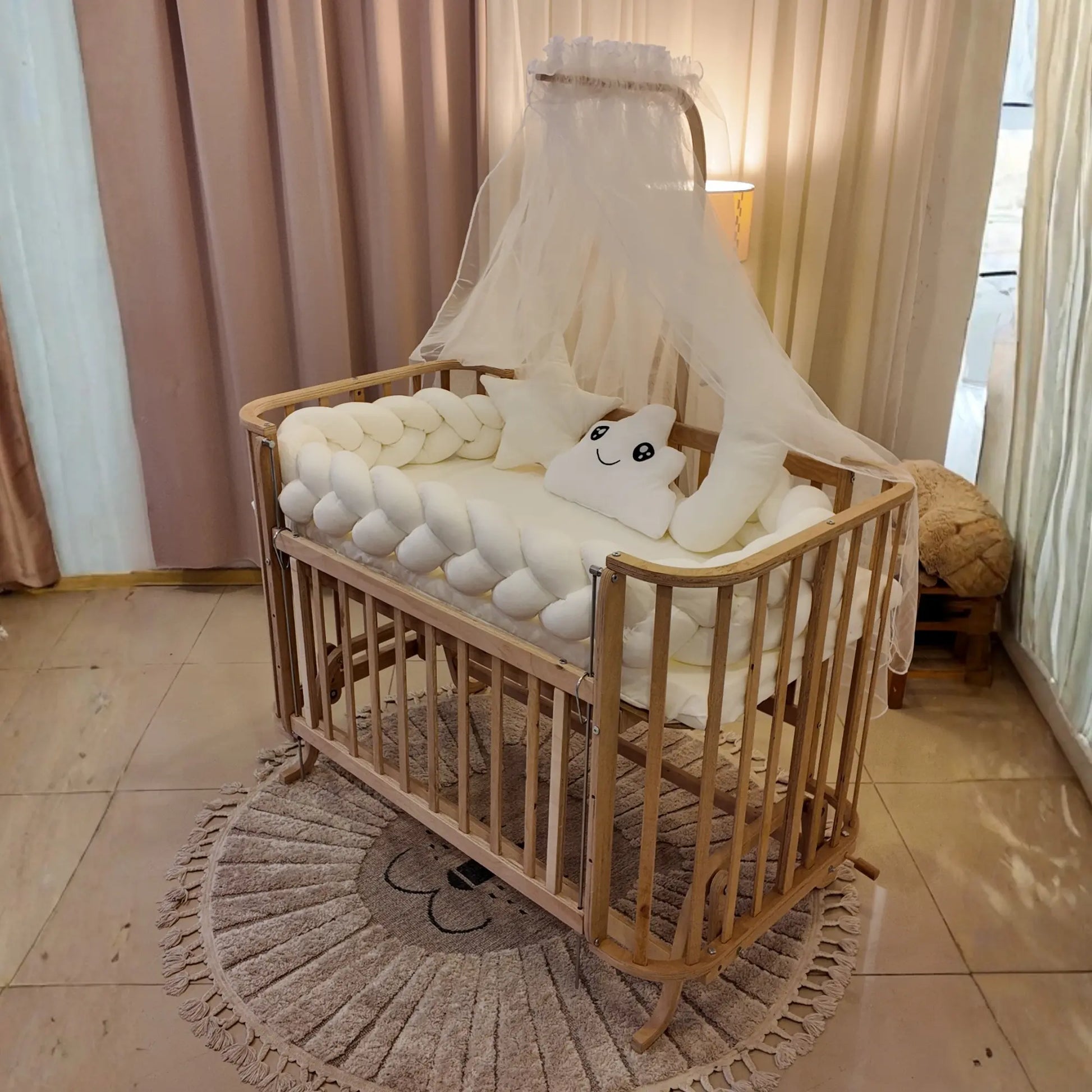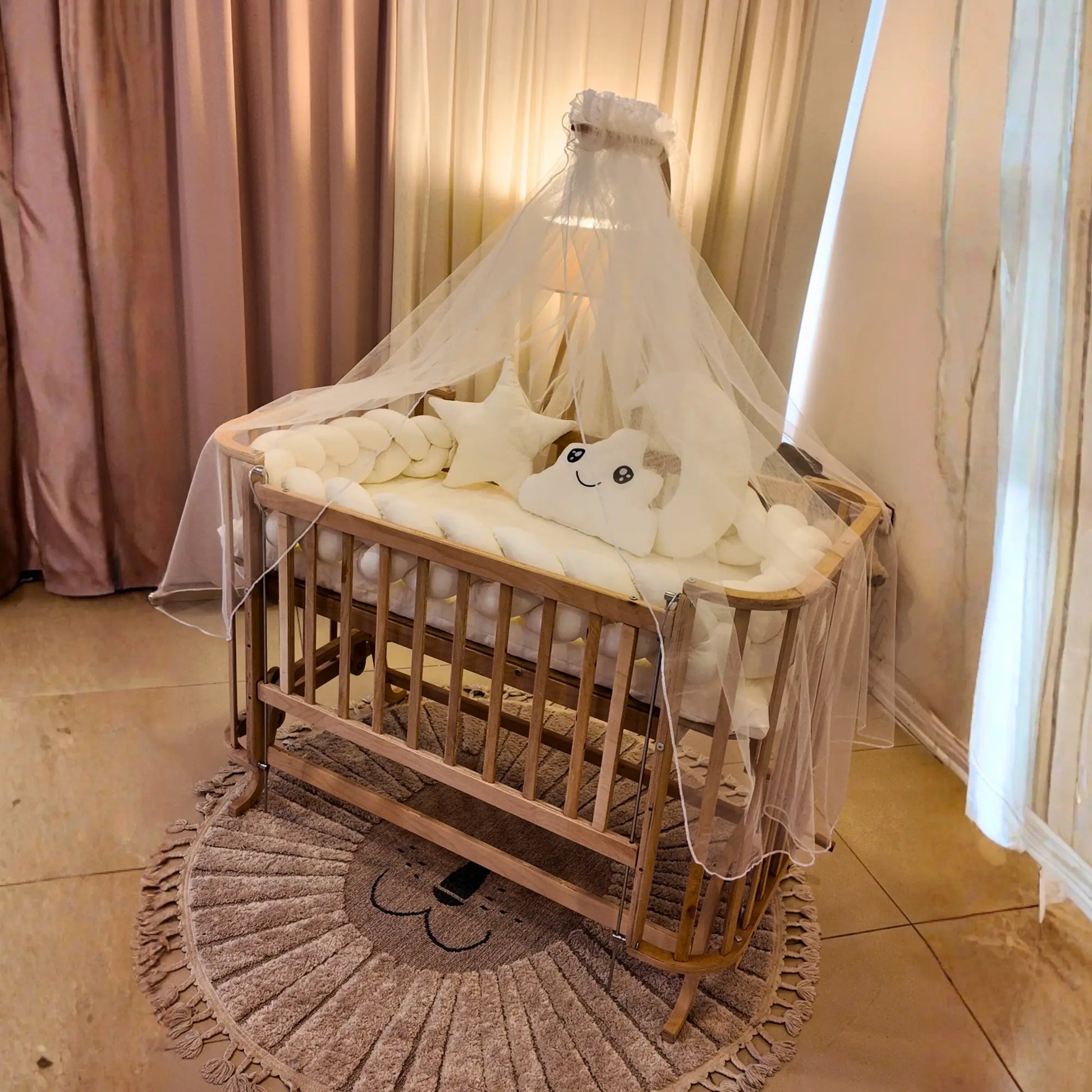 Mabela Ahşap Anne Yanı, Krem Örgü Koruma, Bebek Beşiği, Kademeli, Sallanabilir, 72x124
