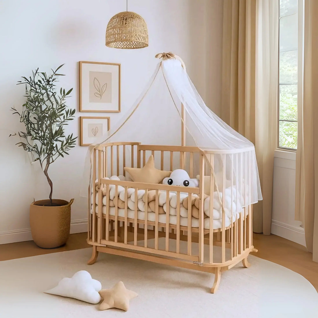 Elyeza Doğal Ahşap 0-5 Yaş Renkli Örgü Korumasıyla Birlikte Anne Yanı Asansörlü Beşik
