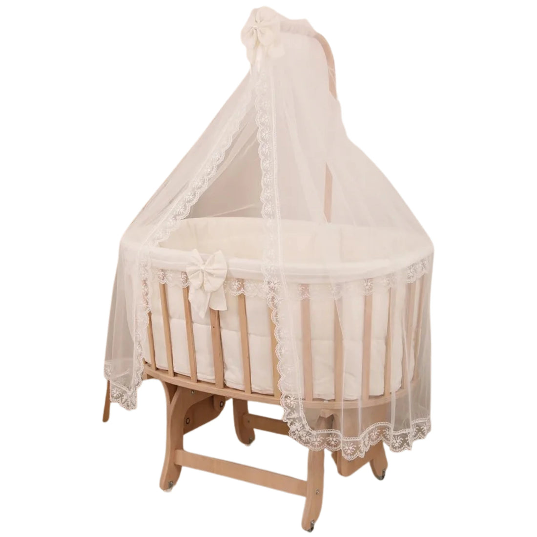 Mabela Ahşap Anne Yanı, Krem Örgü Koruma, Bebek Beşiği, Kademeli, Sallanabilir, 72x124